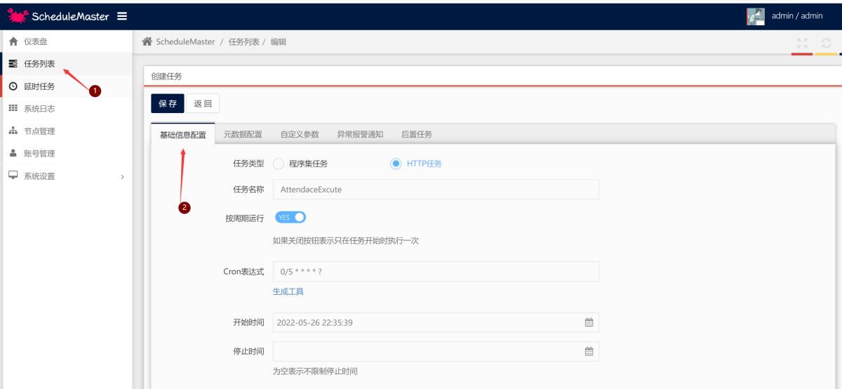 HttpClient client = new HttpClient();List<KeyValuePair<string, string>> args = new List<KeyValuePair<string, string>>();args.Add(new KeyValuePair<string, string>("MetaType", "1"));args.Add(new KeyValuePair<string, string>("RunLoop", "true"));args.Add(new KeyValuePair<string, string>("CronExpression", "33 0/8 * * * ?"));args.Add(new KeyValuePair<string, string>("Remark", "By Xunit Tester Created"));args.Add(new KeyValuePair<string, string>("StartDate", DateTime.Today.ToString("yyyy-MM-dd HH:mm:ss")));args.Add(new KeyValuePair<string, string>("Title", "程序集接口測試任務(wù)"));args.Add(new KeyValuePair<string, string>("AssemblyName", "Hos.ScheduleMaster.Demo"));args.Add(new KeyValuePair<string, string>("ClassName", "Hos.ScheduleMaster.Demo.Simple"));args.Add(new KeyValuePair<string, string>("CustomParamsJson", "[{\"ParamKey\":\"k1\",\"ParamValue\":\"1111\",\"ParamRemark\":\"r1\"},{\"ParamKey\":\"k2\",\"ParamValue\":\"2222\",\"ParamRemark\":\"r2\"}]"));args.Add(new KeyValuePair<string, string>("Keepers", "1"));args.Add(new KeyValuePair<string, string>("Keepers", "2"));//args.Add(new KeyValuePair<string, string>("Nexts", ""));//args.Add(new KeyValuePair<string, string>("Executors", ""));HttpContent reqContent = new FormUrlEncodedContent(args);var response = await client.PostAsync("http://localhost:30000/api/Task/Create", reqContent);var content = await response.Content.ReadAsStringAsync();Debug.WriteLine(content);3.創(chuàng)建HTTP任務(wù)