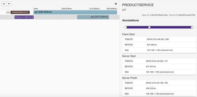 [Route("productapi/[controller]")]public class ProductController : ControllerBase{ private List<ProductDto> productDtos = new List<ProductDto>(); public ProductController() { productDtos.Add(new ProductDto { Id = 1,Name="酒精",Price=22.5m }); productDtos.Add(new ProductDto { Id = 2, Name = "84消毒液", Price = 19.9m }); } /// <summary> /// 獲取所有商品信息 /// </summary> /// <returns></returns> [HttpGet("getall")] public IEnumerable<ProductDto> GetAll() { return productDtos; }}啟動這兩個項目,調用OrderApi的getdetails接口,完成后打開zipkin界面