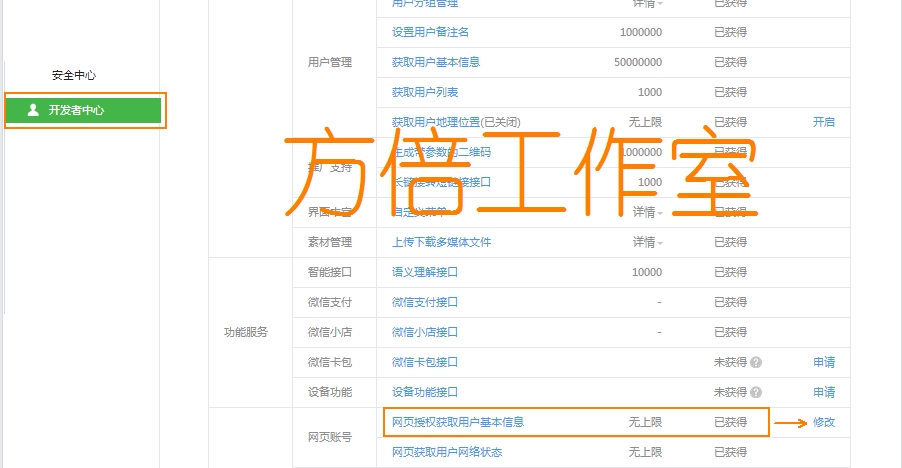 進入微信公眾平臺后臺后,依次進入開發者中心-權限表,找到網頁授權獲取用戶基本信息,