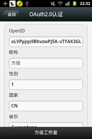 { "openid": "oLVPpjqs9BhvzwPj5A-vTYAX3GLc", "nickname": "方倍", "sex": 1, "language": "zh_CN", "city": "Shenzhen", "province": "Guangdong", "country": "CN", "headimgurl": "http://wx.qlogo.cn/mmopen/utpKYf69VAbCRDRlbUsPsdQN38DoibCkrU6SAMCSNx558eTaLVM8PyM6jlEGzOrH67hyZibIZPXu4BK1XNWzSXB3Cs4qpBBg18/0", "privilege": []}參數解讀: