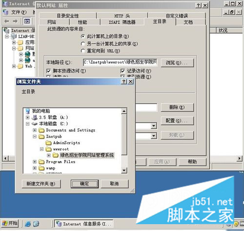 點擊瀏覽中,找到以解壓的asp網(wǎng)站管理系統(tǒng)路徑選上。