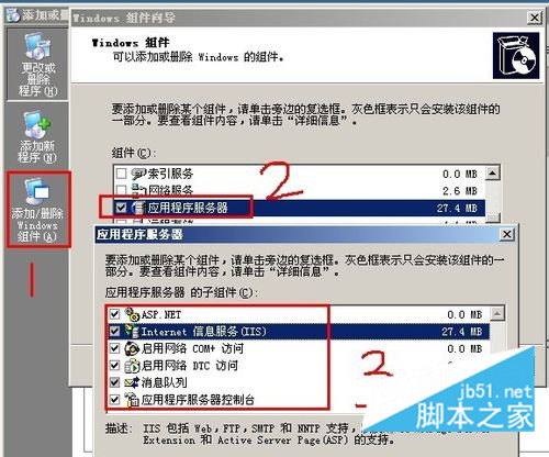 接著我們就看到添加或刪除程序界面,點擊添加刪除windows組件,然后找到應用程序服務器選項,點擊詳細信息,選中所有選項,點擊確定即可。