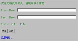 < % title=request.form("title") if title="mr" then %> 歡迎您 Mr.< % =request.form("fname") %> 。 < % elseif title="ms" then %> 歡迎您 Ms.< % =request.form("fname") %> 。< % else %> < B>< font color=blue> 歡迎您 < % =request.form("fname")&" "&request.form("lname") %> 。 < /font>< /B> < % end if %>保存文件 test1.asp ,并在瀏覽器中以 HTTP 方式進行瀏覽,如果此時的系統時間在凌晨 0:00:00 和中午 12:00:00 之間的話,瀏覽器將顯示如下畫面: