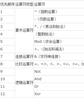 VBScript運(yùn)算符包括算術(shù)運(yùn)算符,連接運(yùn)算符、比較運(yùn)算符和邏輯運(yùn)算符幾種類型。當(dāng)表達(dá)式包含多個(gè)運(yùn)算符時(shí)。將按預(yù)定順序計(jì)算每一部分,該順序稱為運(yùn)算優(yōu)先級(jí)。使用運(yùn)算時(shí)按照先括號(hào)內(nèi)后括號(hào)外的順序執(zhí)行,在括號(hào)中仍要遵循標(biāo)準(zhǔn)運(yùn)算符優(yōu)先級(jí);優(yōu)先級(jí)相同時(shí)按照從左到右的順序計(jì)算。