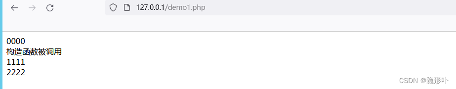 <?phpclass demo1{ private $k1; public function __construct() {echo("構造函數被調用"."<br>"); } public function f1(){echo("f1 函數被調用"); }}echo("0000"."<br>");$f=new demo1();echo("1111"."<br>");$a=serialize($f);echo("2222"."<br>");unserialize($a);?>輸出結果