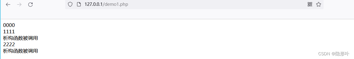 <?phpclass demo1{ private $k1; public function __destruct() {echo("析構函數被調用"."<br>"); }}$f=new demo1();echo("0000"."<br>");$a=serialize($f);echo("1111"."<br>");unset($f);echo("2222"."<br>");unserialize($a);?>輸出結果