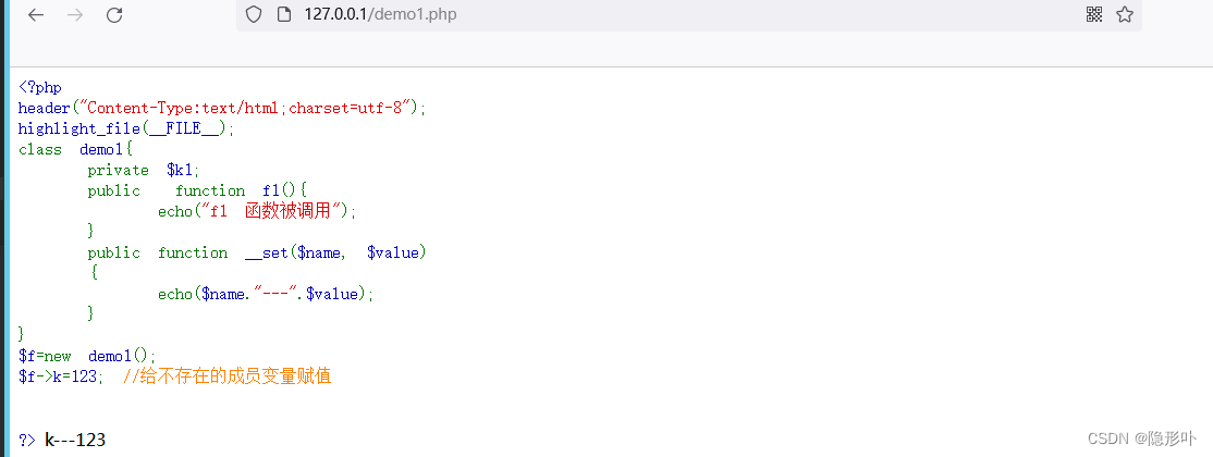 <?phpheader("Content-Type:text/html;charset=utf-8");highlight_file(__FILE__);class demo1{ private $k1; public function f1(){echo("f1 函數被調用"); } public function __set($name, $value) {echo($name."---".$value); }}$f=new demo1();$f->k=123; //給不存在的成員變量賦值?>輸出結果