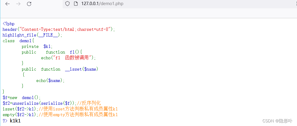 <?phpheader("Content-Type:text/html;charset=utf-8");highlight_file(__FILE__);class demo1{ private $k1; public function f1(){echo("f1 函數被調用"); } public function __isset($name) { echo($name); }}$f=new demo1();$f2=unserialize(serialize($f));//反序列化isset($f2->k1);//使用isset方法判斷私有成員屬性k1empty($f2->k1);//使用empty方法判斷私有成員屬性k1?>輸出結果