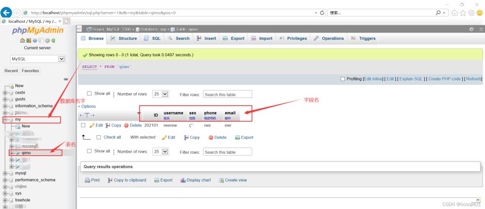 3.在數據庫里面創建好名為“my”的數據庫,并且建立 名為 qimo 的表,表里面含有字段名有 ID、username、sex、phone、email 等5個