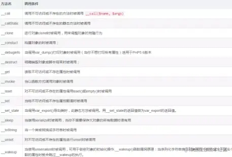 <?phpclass User{ public function __destruct() {echo "xino</br>"; }}$test = new User();$ser = serialize($test);unserialize($ser);?>執行后會發現調用了魔術方法,我們要想辦法來尋找代碼之間的關系來構造 反序列化鏈,常見魔術方法如下:
