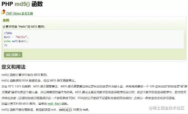 對(duì)于MD5加密大家一定很熟悉,在PHP里同樣存在函數(shù)MD5,該函數(shù)可以將指定的字符串通過(guò)哈希函數(shù)轉(zhuǎn)為復(fù)雜的加密字符串。在CTF中有著關(guān)于MD5的最基本的知識(shí),即強(qiáng)/弱類型比較。