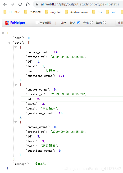 <?php $libstatis="{ "code": 0, "data": [{ "answer_count": 14, "created_at": "2019-09-06 16:35:06", "id": 1, "level": 1, "name": "初級(jí)題庫", "questions_count": 171 }, { "answer_count": 9, "created_at": "2019-09-06 16:35:20", "id": 2, "level": 2, "name": "中級(jí)題庫", "questions_count": 15 }, { "answer_count": 0, "created_at": "2019-09-06 16:35:30", "id": 3, "level": 3, "name": "高級(jí)題庫", "questions_count": 0 }], "message": "操作成功" }"; echo $libstatis;結(jié)果: