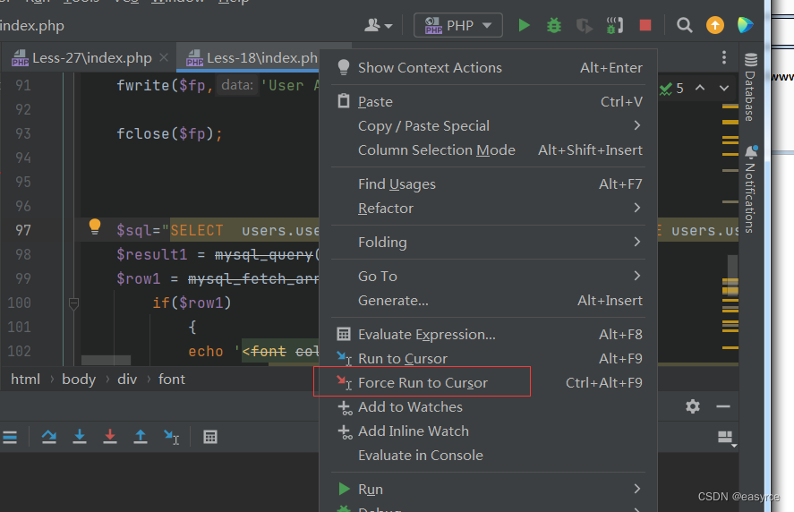 當(dāng)我們想快速跳轉(zhuǎn)到想要執(zhí)行的語(yǔ)句的時(shí)候,可以右鍵點(diǎn)擊紅色Force Run to Cursor進(jìn)行強(qiáng)制跳轉(zhuǎn)