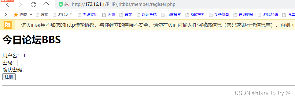 <html><head> <meta charset="utf-8"> <title> 注冊----今日論壇</title></head><body> <h1>今日論壇BBS</h1> <form action="./addUser.php"method="post" >用戶名:<input type="text" name="userName"><br/>密碼:<input type="password" name="userPass1"><br/>確認密碼:<input type="password" name="userPass2"><br/><input type="submit" name="userSubmit" value="注冊"> </form> <hr/></body></html>