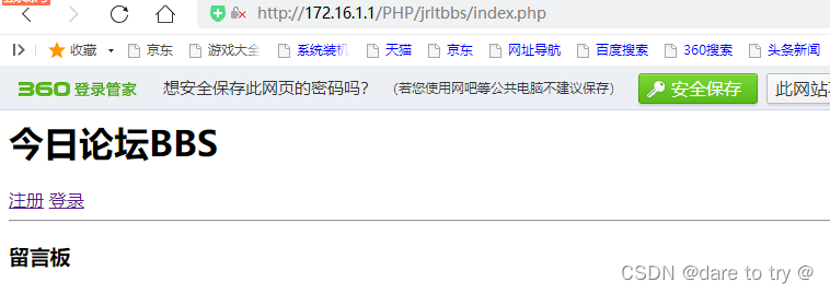 <html><head> <meta charset="utf-8"> <title> 首頁----今日論壇</title></head><body> <h1>今日論壇BBS</h1> <?php if(isset($_COOKIE["name"])){echo "歡迎來到今日論壇BBS,".$_COOKIE["name"]."<br/>";echo "<a href="./member/index.php">個人中心</a> ";echo "<a href="./member/logout.php">注銷</a>"; }else{ echo " <a href="./member/register.php">注冊</a> ";echo "<a href="./member/login.php">登錄</a> "; } ?> <hr/> <h3>留言板</h3></body></html>3.3 個人中心注冊頁面./member/register.php