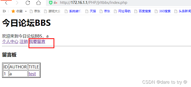 <?phpinclude "./inc/dblink.inc.php"http://將數據庫連接的文件包含到此文件中?><html><head><meta charset = "utf-8"><title>留言論壇</title></head><body><?phpif(isset($_COOKIE["name"])){ $html=<<<HTML <form method="post"> 標題:<input type="text" name="userTitle"><br/> 留言內容:<br/> <textarea name="userContent"></textarea> <input type="submit" name="userSubmit" value="提交"> </form>HTML; echo $html."<br>"; if(isset($_POST["userSubmit"]) && isset($_POST["userTitle"])){$userName=$_COOKIE["name"];$title=mysqli_real_escape_string($link,$_POST["userTitle"]) ;//將提交的文本進行轉義$content=mysqli_real_escape_string($link,$_POST["userContent"]);$sql="INSERT INTO `messages`( `uname`, `title`, `content`) VALUES ("".$userName."","".$title."","".$content."")";if($results=mysqli_query($link,$sql)){ echo "留言成功,<a href="./index.php">返回首頁</a>";}else{ echo mysqli_error($link);} }else{echo "請提交"; }}else{ echo "您還未登錄,<a href="./member/login.php">請登錄</a>";}?></body></html><?phpmysqli_close($link);?>4.4 測試