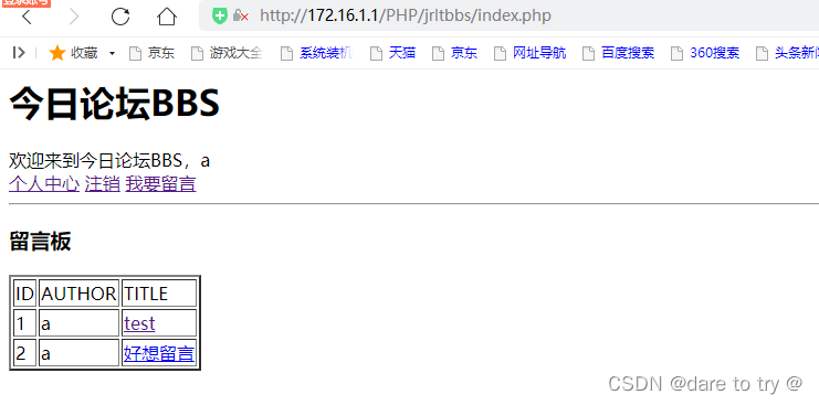 <?phpinclude "./inc/dblink.inc.php"http://將數據庫連接的文件包含到此文件中?><html><head> <meta charset="utf-8"> <title> 首頁----今日論壇</title></head><body> <h1>今日論壇BBS</h1> <?php if(isset($_COOKIE["name"])){echo "歡迎來到今日論壇BBS,".$_COOKIE["name"]."<br/>";echo "<a href="./member/index.php">個人中心</a> ";echo "<a href="./member/logout.php">注銷</a> "; }else{ echo " <a href="./member/register.php">注冊</a> ";echo "<a href="./member/login.php">登錄</a> "; } echo "<a href="./addMessage.php">我要留言</a>"; ?> <hr/> <h3>留言板</h3> <?php $sql="select * from messages"; if($results=mysqli_query($link,$sql)){if(mysqli_num_rows($results)>0){ echo "<table border=2>"; echo "<tr><td>ID</td><td>AUTHOR</td><td>TITLE</td></tr>"; while($result=mysqli_fetch_assoc($results)){echo "<tr><td>{$result["id"]}</td><td>{$result["uname"]}</td><td><a href="showmessage.php?id={$result["id"]}" target="_blank">{$result["title"]}</a></td></tr>"; } echo "</table>";}else{ echo "暫無留言內容";} }else{echo mysqli_error($link); } ?></body></html><?phpmysqli_close($link);?>4.2 顯示留言內容頁面./showmessage.php