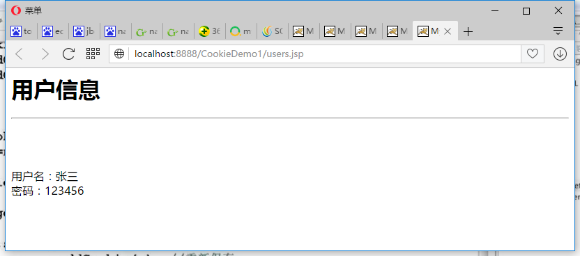 <%@ page language="java" import="java.util.*,java.net.*" contentType="text/html; charset=utf-8"%><%String path = request.getContextPath();String basePath = request.getScheme()+"://"+request.getServerName()+":"+request.getServerPort()+path+"/";%> <!DOCTYPE HTML PUBLIC "-//W3C//DTD HTML 4.01 Transitional//EN"><html> <head> <base href="<%=basePath%>" rel="external nofollow" rel="external nofollow" rel="external nofollow" > <title>My JSP "users.jsp" starting page</title> <meta http-equiv="pragma" content="no-cache"> <meta http-equiv="cache-control" content="no-cache"> <meta http-equiv="expires" content="0"> <meta http-equiv="keywords" content="keyword1,keyword2,keyword3"> <meta http-equiv="description" content="This is my page"> <!-- <link rel="stylesheet" type="text/css" href="styles.css" rel="external nofollow" rel="external nofollow" rel="external nofollow" > --> </head> <body> <h1>用戶信息</h1> <hr> <% request.setCharacterEncoding("utf-8"); String username=""; String password = ""; Cookie[] cookies = request.getCookies(); if(cookies!=null&&cookies.length>0) { for(Cookie c:cookies) { if(c.getName().equals("username")) { username = URLDecoder.decode(c.getValue(),"utf-8"); } if(c.getName().equals("password")) { password = URLDecoder.decode(c.getValue(),"utf-8"); } } } %> <BR> <BR> <BR> 用戶名:<%=username %><br> 密碼:<%=password %><br> </body></html>三 測試