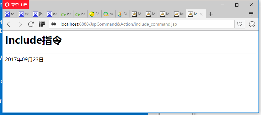 <%@ page language="java" import="java.util.*" contentType="text/html; charset=utf-8"%><%String path = request.getContextPath();String basePath = request.getScheme()+"://"+request.getServerName()+":"+request.getServerPort()+path+"/";%> <!DOCTYPE HTML PUBLIC "-//W3C//DTD HTML 4.01 Transitional//EN"><html> <head> <base href="<%=basePath%>" rel="external nofollow" > <title>My JSP "Include_Command.jsp" starting page</title> <meta http-equiv="pragma" content="no-cache"> <meta http-equiv="cache-control" content="no-cache"> <meta http-equiv="expires" content="0"> <meta http-equiv="keywords" content="keyword1,keyword2,keyword3"> <meta http-equiv="description" content="This is my page"> <!-- <link rel="stylesheet" type="text/css" href="styles.css" rel="external nofollow" > --> </head> <body> <h1>Include指令</h1> <hr> <%@ include file="date.jsp"%> </body></html>