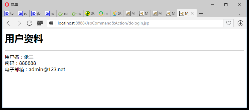 <%@ page language="java" import="java.util.*" contentType="text/html; charset=utf-8"%><%String path = request.getContextPath();String basePath = request.getScheme()+"://"+request.getServerName()+":"+request.getServerPort()+path+"/";%> <!DOCTYPE HTML PUBLIC "-//W3C//DTD HTML 4.01 Transitional//EN"><html> <head> <base href="<%=basePath%>" rel="external nofollow" rel="external nofollow" rel="external nofollow" > <title>My JSP "user.jsp" starting page</title> <meta http-equiv="pragma" content="no-cache"> <meta http-equiv="cache-control" content="no-cache"> <meta http-equiv="expires" content="0"> <meta http-equiv="keywords" content="keyword1,keyword2,keyword3"> <meta http-equiv="description" content="This is my page"> <!-- <link rel="stylesheet" type="text/css" href="styles.css" rel="external nofollow" rel="external nofollow" rel="external nofollow" > --> </head> <body> <h1>用戶資料</h1> <hr> <% request.setCharacterEncoding("utf-8"); String username = ""; String password = ""; String email = ""; if(request.getParameter("username")!=null) { username = request.getParameter("username"); } if(request.getParameter("password")!=null) { password = request.getParameter("password"); } if(request.getParameter("email")!=null) { email = request.getParameter("email"); } %> 用戶名:<%=username %><br> 密碼:<%=password %><br> 電子郵箱:<%=email %><br> </body></html> 三 運行結果