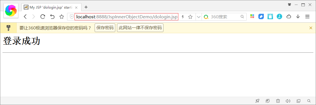<%@ page language="java" import="java.util.*" contentType="text/html; charset=utf-8"%><%String path = request.getContextPath();String basePath = request.getScheme()+"://"+request.getServerName()+":"+request.getServerPort()+path+"/";%> <!DOCTYPE HTML PUBLIC "-//W3C//DTD HTML 4.01 Transitional//EN"><html> <head> <base href="<%=basePath%>" rel="external nofollow" rel="external nofollow" > <title>My JSP "dologin.jsp" starting page</title> <meta http-equiv="pragma" content="no-cache"> <meta http-equiv="cache-control" content="no-cache"> <meta http-equiv="expires" content="0"> <meta http-equiv="keywords" content="keyword1,keyword2,keyword3"> <meta http-equiv="description" content="This is my page"> <!-- <link rel="stylesheet" type="text/css" href="styles.css" rel="external nofollow" rel="external nofollow" > --> </head> <body> <h1>登錄成功</h1> <hr> </body></html>