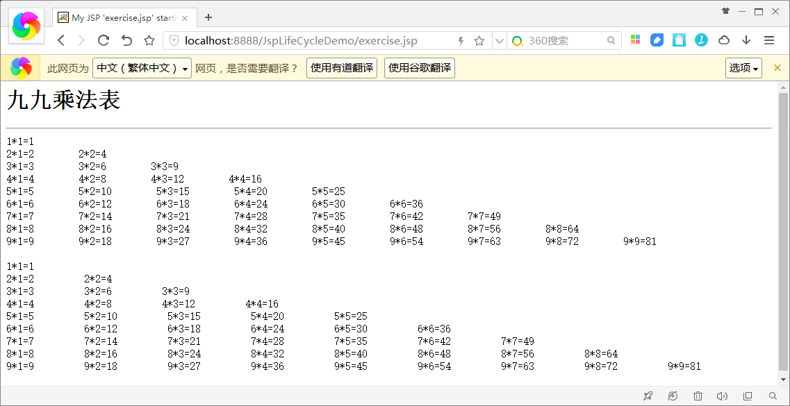 <%@ page language="java" import="java.util.*" contentType="text/html; charset=utf-8"%><%String path = request.getContextPath();String basePath = request.getScheme()+"://"+request.getServerName()+":"+request.getServerPort()+path+"/";%> <!DOCTYPE HTML PUBLIC "-//W3C//DTD HTML 4.01 Transitional//EN"><html> <head> <base href="<%=basePath%>" rel="external nofollow" > <title>My JSP "exercise.jsp" starting page</title> <meta http-equiv="pragma" content="no-cache"> <meta http-equiv="cache-control" content="no-cache"> <meta http-equiv="expires" content="0"> <meta http-equiv="keywords" content="keyword1,keyword2,keyword3"> <meta http-equiv="description" content="This is my page"> <!-- <link rel="stylesheet" type="text/css" href="styles.css" rel="external nofollow" > --> </head> <body> <%! //返回九九乘法表對應(yīng)的HTML代碼,通過表達式來調(diào)用,在頁面上顯示 String printMultiTable1() { String s = ""; for(int i=1;i<=9;i++) { for(int j=1;j<=i;j++) {s+=i+"*"+j+"="+(i*j)+" "; } s+="<br>"; //追加換行標(biāo)簽 } return s; } //JSP內(nèi)置out對象,使用腳本方式調(diào)用,打印九九乘法表 void printMultiTable2(JspWriter out) throws Exception { for(int i=1;i<=9;i++) { for(int j=1;j<=i;j++) {out.println(i+"*"+j+"="+(i*j)+" "); } out.println("<br>"); //追加換行標(biāo)簽 } } %> <h1>九九乘法表</h1> <hr> <%=printMultiTable1()%> <br> <% printMultiTable2(out);%> <br> </body></html>二 運行效果