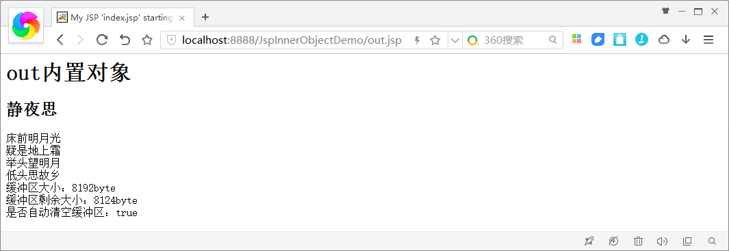 <%@ page language="java" import="java.util.*" contentType="text/html; charset=utf-8"%><%String path = request.getContextPath();String basePath = request.getScheme()+"://"+request.getServerName()+":"+request.getServerPort()+path+"/";%> <!DOCTYPE HTML PUBLIC "-//W3C//DTD HTML 4.01 Transitional//EN"><html> <head> <base href="<%=basePath%>" rel="external nofollow" > <title>My JSP "index.jsp" starting page</title> <meta http-equiv="pragma" content="no-cache"> <meta http-equiv="cache-control" content="no-cache"> <meta http-equiv="expires" content="0"> <meta http-equiv="keywords" content="keyword1,keyword2,keyword3"> <meta http-equiv="description" content="This is my page"> <!-- <link rel="stylesheet" type="text/css" href="styles.css" rel="external nofollow" > --> </head> <body> <h1>out內置對象</h1> <% out.println("<h2>靜夜思</h2>"); out.println("床前明月光<br>"); out.println("疑是地上霜<br>"); out.flush(); //out.clear();//這里會拋出異常。 out.clearBuffer();//這里不會拋出異常。 out.println("舉頭望明月<br>"); out.println("低頭思故鄉<br>"); %> 緩沖區大小:<%=out.getBufferSize() %>byte<br> 緩沖區剩余大小:<%=out.getRemaining() %>byte<br> 是否自動清空緩沖區:<%=out.isAutoFlush() %><BR> </body></html>五 運行結果