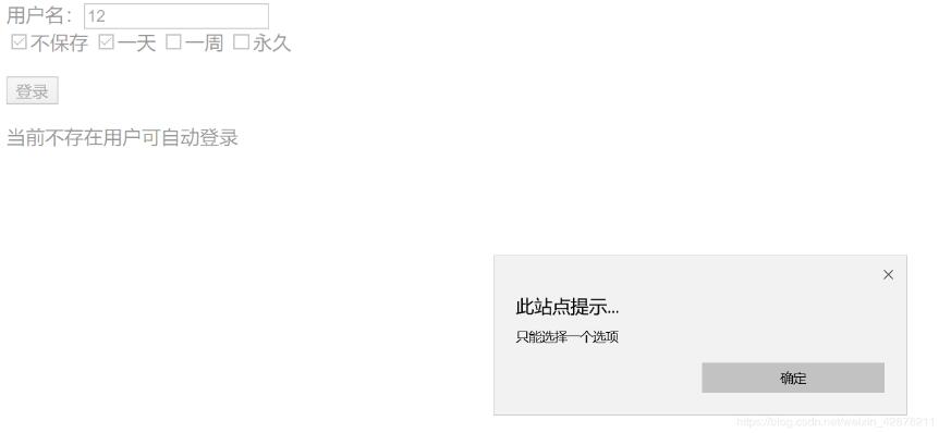 <%@ page language="java" import="java.util.*" pageEncoding="utf-8"%><%String path = request.getContextPath();String basePath = request.getScheme()+"://"+request.getServerName()+":"+request.getServerPort()+path+"/";%><%request.setCharacterEncoding("GB2312"); %><!DOCTYPE HTML PUBLIC "-//W3C//DTD HTML 4.01 Transitional//EN"><html> <head> <base href="<%=basePath%>" rel="external nofollow" rel="external nofollow" > <title>My JSP "login.jsp" starting page</title> <meta http-equiv="pragma" content="no-cache"> <meta http-equiv="cache-control" content="no-cache"> <meta http-equiv="expires" content="0"> <meta http-equiv="keywords" content="keyword1,keyword2,keyword3"> <meta http-equiv="description" content="This is my page"> <!-- <link rel="stylesheet" type="text/css" href="styles.css" rel="external nofollow" rel="external nofollow" > --> <script type="text/javascript"> window.onload = function(){ //獲取submit var submit = document.getElementById("submit"); var name = document.getElementById("name"); //為submit綁定單擊響應(yīng)函數(shù) submit.onclick = function(){ times = document.getElementsByName("time"); var count=0; for(var i=0;i<times.length;i++){ if(times[i].checked == true){ count++; } } if(count>=2){ alert("只能選擇一個(gè)選項(xiàng)"); return false; } }; }; </script> </head> <body> <!-- 設(shè)置html頁(yè)面 --> <form action="sucess.jsp" method="post"> 用戶名:<input name="username" /><br/> <input type="checkbox" name="time" value="notSave" />不保存 <input type="checkbox" name="time" value="aDay" />一天 <input type="checkbox" name="time" value="aWeek" />一周 <input type="checkbox" name="time" value="forever" />永久 <br/><br/> <input type="submit" name="submit" id="submit" value="登錄"/> </form> <% //讀取session值 String val= (String)session.getAttribute("name"); //如果session不存在 if(val==null){ val ="不存在"; } out.print("當(dāng)前\""+val+"\"用戶可自動(dòng)登錄"); %> </body></html>sucess.jsp