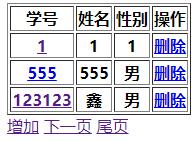 <%@page import="java.util.List"%><%@page import="org.ThreeLayer.Entity.Student"%><%@page import="org.ThreeLayer.Entity.Page_S"%><%@ page language="java" contentType="text/html; charset=UTF-8" pageEncoding="UTF-8"%><!DOCTYPE html><html><head><meta charset="UTF-8"><title>學生信息管理</title></head><body> <table border=1px> <tr> <th>學號</th> <th>姓名</th> <th>性別</th> <th>操作</th> </tr> <% Page_S pagg=(Page_S)request.getAttribute("pag"); for(Student student:pagg.getStudents()) { %> <tr> <th><a href="FindStudentById_Servlet?uid=<%=student.getId()%>" ><%=student.getId() %></a></th> <th><%=student.getName() %></th> <th><%=student.getSex() %></th> <th><a href="DeleteStudent_Servlet?uid=<%=student.getId()%>" >刪除</a></th> </tr> <% } %> </table> <a href="add.jsp" >增加</a> <% if(pagg.getCurrentPage()==0)//用戶位于首頁的時候 { %> <a href="findStudentByPage?currentPage=<%=pagg.getCurrentPage()+1%>" >下一頁</a> <a href="findStudentByPage?currentPage=<%=pagg.getTotalPage()-1%>" >尾頁</a> <% }else if(pagg.getCurrentPage()==pagg.getTotalPage()-1)//用戶位于尾頁的時候 { %> <a href="findStudentByPage?currentPage=0" >首頁</a> <a href="findStudentByPage?currentPage=<%=pagg.getCurrentPage()-1%>" >上一頁</a> <% }else//用戶位于中間頁面的時候 { %> <a href="findStudentByPage?currentPage=0" >首頁</a> <a href="findStudentByPage?currentPage=<%=pagg.getCurrentPage()+1%>" >下一頁</a> <a href="findStudentByPage?currentPage=<%=pagg.getCurrentPage()-1%>" >上一頁</a> <a href="findStudentByPage?currentPage=<%=pagg.getTotalPage()-1%>" >尾頁</a> <% } %> <br></body></html>看一下效果圖: