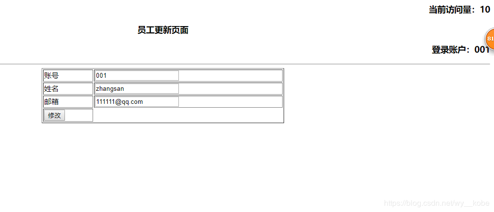 %-- Created by IntelliJ IDEA. User: wangy Date: 2018/11/8 Time: 15:27 To change this template use File | Settings | File Templates.--%><%@ page contentType="text/html;charset=UTF-8" language="java" %><html><head> <title>員工更新頁面</title></head><body> <h3 align="right">當前訪問量:<%=application.getAttribute("count")%></h3> <h3 align="center">員工更新頁面</h3> <%--獲取session中的值并顯示到頁面上--%> <h3 align="right">登錄賬戶:<%=session.getAttribute("account")%></h3> <hr> <form action="update-control.jsp"> <table align="center" border="1" width="500px"> <tr> <%--value="<%=request.getParameter("account")%>"可用于實現數據的回顯--%> <td>賬號</td> <td><input type="text" name="account" value="<%=request.getParameter("account")%>"></td> </tr> <tr> <td>姓名</td> <td><input type="text" name="name" value="<%=request.getParameter("name")%>"></td> </tr> <tr> <td>郵箱</td> <td><input type="text" name="email" value="<%=request.getParameter("email")%>"></td> </tr> <tr> <td> <input type="submit" value="修改"> </td> </tr> </table> </form></body></html>update-control 執行修改操作的控制頁面