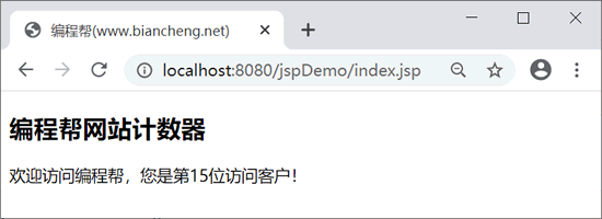 <%@ page language="java" contentType="text/html; charset=UTF-8" pageEncoding="UTF-8"%><%@ page import="java.util.*"%><!DOCTYPE html><html><head></head><body> <%Integer count = (Integer) application.getAttribute("count");if (count == null) { count = 1;} else { count++;}application.setAttribute("count", count); %> <h2>編程幫網(wǎng)站計數(shù)器</h2> 歡迎訪問編程幫,您是第<%=count%>位訪問客戶!</body></html>運行結(jié)果如下: