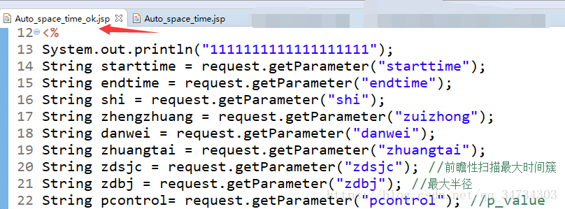 以下為我程序的一部分,Auto_space_time_ok.jsp文件從Auto_space_time.jsp獲取的值代碼,此處博主需要做一個判斷,當danwei 等于“學校”字符串時,將 zhuangtai的值賦值給zhengzhuang