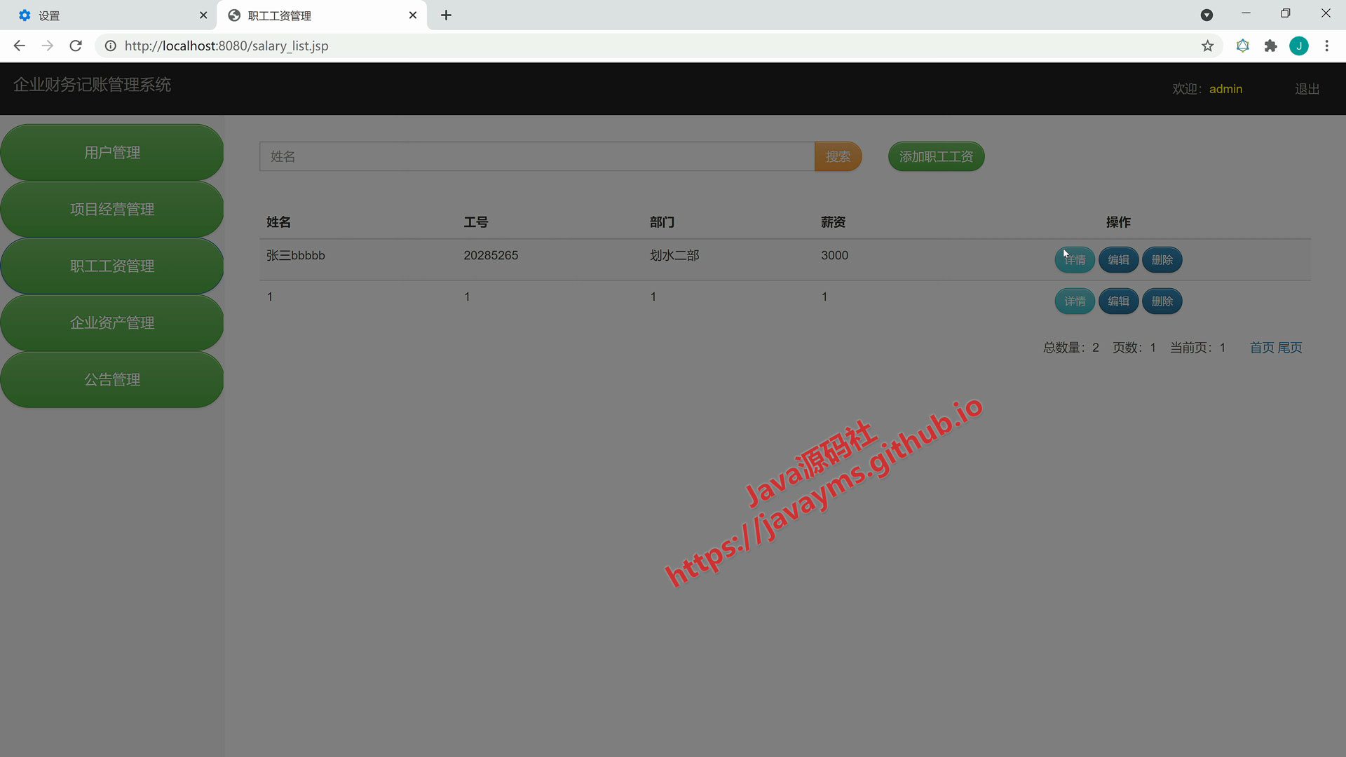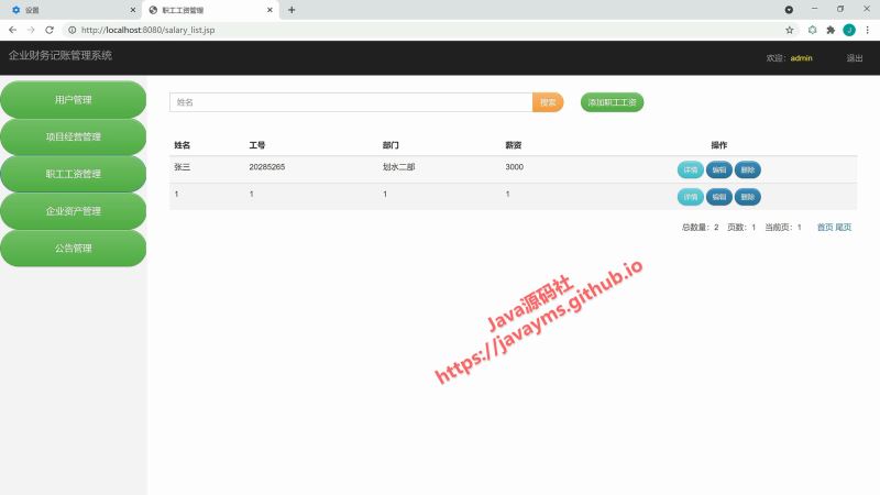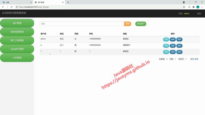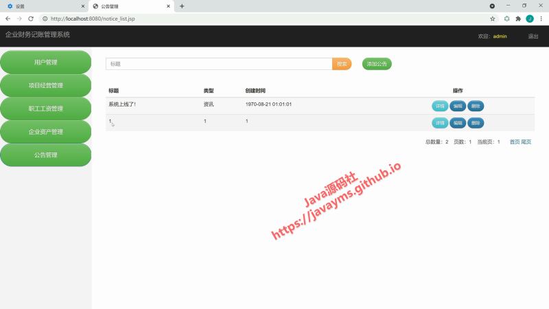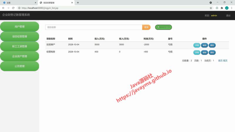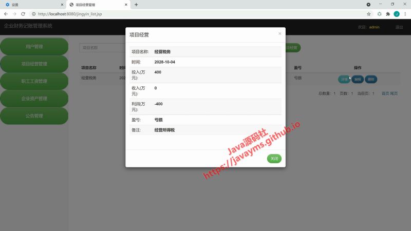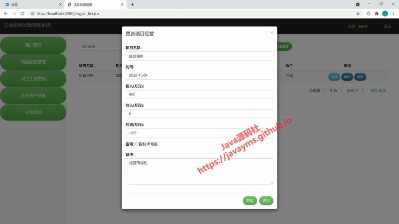 modal.find("#edit-jingyinLirun").val(vo.jingyinLirun);for (let val of "盈利/虧損".split("/")) { if (val == vo.jingyinStatus) {modal.find("#edit-jingyinStatus_" + vo.jingyinStatus).prop("checked", true); } else {modal.find("#edit-jingyinStatus_" + vo.jingyinStatus).removeAttr("checked"); }};modal.find("#edit-jingyinText").val(vo.jingyinText); }}) }) $("#modal-info").on("show.bs.modal", function (event) {let button = $(event.relatedTarget);let id = button.data("id");let modal = $(this);$.ajax({ url: "JingyinServlet?action=get&id=" + id, type: "get",<div> <button type="button" <c:if test="${loginUser.userType != "管理員"}">disabled="disabled" title="沒有權限!!!"</c:if> data-toggle="modal" data-target="#modal-add">添加項目經營 </button></div> </div> <br> <br> <div><table> <thead> <tr> <th>項目名稱</th><body><nav> <div><div> <button type="button" data-toggle="collapse" data-target="#navbar" aria-expanded="false" aria-controls="navbar"><span>企業財務記賬管理系統</span> <span></span><span></span> <span></span> </button> <a href="#" rel="external nofollow" rel="external nofollow" >企業財務記賬管理系統</a></div><div id="navbar"> <ul><li><a href="#" rel="external nofollow" rel="external nofollow" >歡迎:<span>${loginUser.username}</span></a></li> function addCheck() {//根據ID獲取值if (document.getElementById("add-jingyinName").value.trim().length == 0) { alert("項目名稱不能為空"); return false;}if (document.getElementById("add-jingyinDate").value.trim().length == 0) { alert("時間不能為空"); return false;}if (document.getElementById("add-jingyinTou").value.trim().length == 0) { alert("投入(萬元)不能為空"); return false;}</div><div> <button type="button" data-dismiss="modal">取消</button> <button type="submit">刪除</button></div> </form></div> </div></div></body><script> $("#modal-delete").on("show.bs.modal", function (event) {let button = $(event.relatedTarget);let id = button.data("id");let modal = $(this);modal.find("#delete-id").val(id); }) alert("收入(萬元)不能為空"); return false;}if (document.getElementById("add-jingyinLirun").value.trim().length == 0) { alert("利潤(萬元)不能為空"); return false;}return true; } //編輯表單提交之前進行檢查,如果return false,則不允許提交 function editCheck() {//根據ID獲取值if (document.getElementById("edit-jingyinName").value.trim().length == 0) { alert("項目名稱不能為空"); return false;}if (document.getElementById("edit-jingyinDate").value.trim().length == 0) { alert("時間不能為空");效果圖