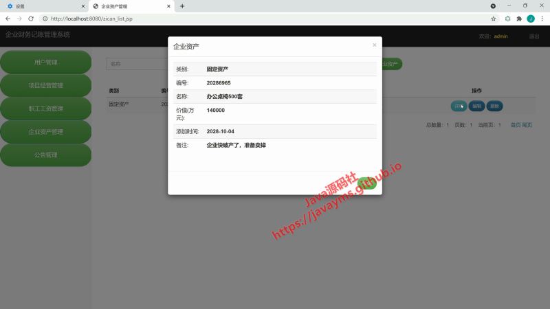 登錄、注冊、退出、用戶模塊、公告模塊、職工工資模塊、企業資產模塊、項目經營模塊的增刪改查管理
