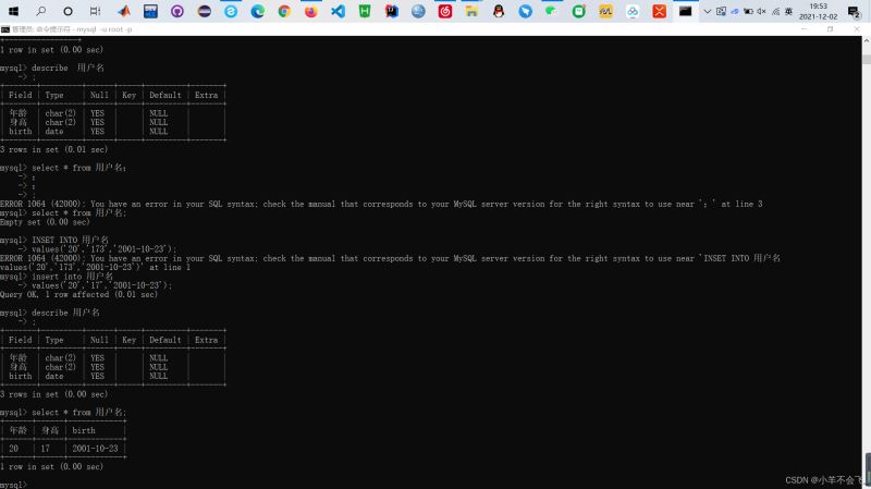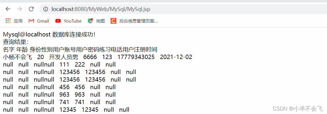 <%@ page language="java" contentType="text/html; charset=UTF-8" pageEncoding="UTF-8"%><%@ page import="java.sql.*"%><!DOCTYPE html><html><head> <meta charset="UTF-8"> <title>Insert title here</title></head><body><% try {Class.forName("com.mysql.jdbc.Driver"); 驅(qū)動程序名//com.mysql.jdbc.cj.Driver也是OK的String url = ""; //數(shù)據(jù)庫名 ?后面的是為了指定字符的編碼、解碼格式。String username = "root"; //數(shù)據(jù)庫用戶名String password = "123456"; //數(shù)據(jù)庫用戶密碼Connection conn = DriverManager.getConnection(url, username, password); //連接狀態(tài) if(conn != null){ out.println("數(shù)據(jù)庫連接成功!"); out.print("<br />"); Statement stmt = null; ResultSet rs = null; String sql = "SELECT *FROM 用戶名;"; //查詢語句 stmt = conn.createStatement(); rs = stmt.executeQuery(sql); out.print("查詢結(jié)果:"); out.print("<br />"); out.println("名字"+" "+"年齡 "+" "+"身份"+"性別"+"用戶賬號"+"用戶密碼"+"練習(xí)電話"+"用戶注冊時間"); out.print("<br />"); while (true) {try { if (!rs.next()) break; out.println(rs.getString("名字")+"   "+rs.getString("年齡")+"   "+rs.getString("身份")+rs.getString("性別")+"   "+rs.getString("用戶賬號")+"   "+rs.getString("用戶密碼")+"   " +rs.getString("聯(lián)系電話")+"   "+rs.getString("用戶注冊時間")+"   "); //將查詢結(jié)果輸出 out.print("<br/>");} catch (SQLException throwables) { throwables.printStackTrace();}//out.println(rs.getString("名字")+"   "+rs.getString("年齡")+"   "+rs.getString("身份")+rs.getString("性別")+"   "+rs.getString("用戶賬號")+"   "+rs.getString("用戶密碼")+"   "http://+rs.getString("聯(lián)系電話")+"   "+rs.getString("用戶注冊時間")+"   "); //將查詢結(jié)果輸出//out.print("<br/>"); }}else{ out.print("連接失敗!");} } catch (ClassNotFoundException e) {e.printStackTrace(); }// catch (SQLException e)// {//e.printStackTrace();// }%></body></html>連接成功,頁面顯示如下