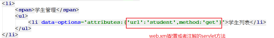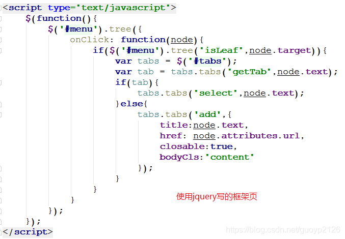 <%@ page contentType="text/html;charset=UTF-8" language="java" %><html><head> <meta charset="UTF-8"> <title>歡迎頁面</title> <link rel="stylesheet" type="text/css" href="js/themes/default/easyui.css" rel="external nofollow" > <link rel="stylesheet" type="text/css" href="js/themes/icon.css" rel="external nofollow" > <link rel="stylesheet" type="text/css" href="js/demo.css" rel="external nofollow" > <script type="text/javascript" src="js/jquery.min.js"></script> <script type="text/javascript" src="js/jquery.easyui.min.js"></script> <style type="text/css">.content { padding: 10px 10px 10px 10px;} </style></head><body><div data-options="region:"west",title:"菜單",split:true"> <ul id="menu"><li> <span>學生管理</span> <ul><li data-options="attributes:{"url":"student",method:"get"}">學生列表</li> </ul></li> </ul></div><div data-options="region:"center",title:"""> <div id="tabs"><div title="首頁"> <h1>javaWeb測試</h1></div> </div></div></body></html><script type="text/javascript"> $(function(){$("#menu").tree({ onClick: function(node){if($("#menu").tree("isLeaf",node.target)){ var tabs = $("#tabs"); var tab = tabs.tabs("getTab",node.text); if(tab){tabs.tabs("select",node.text); }else{tabs.tabs("add",{ title:node.text, href: node.attributes.url, closable:true, bodyCls:"content"}); }} }}); });</script>核心代碼說明: