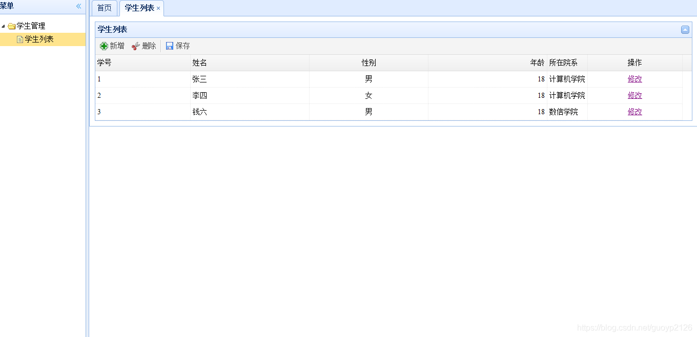 <%@ page contentType="text/html;charset=UTF-8" language="java" %><table id="itemList" title="學生列表" opts.striped="true" fitColumns="true" data-options="singleSelect:true,collapsible:true,url:"student",method:"post",toolbar:toolbar"> <thead> <tr><th data-options="field:"sno",width:80">學號</th><th data-options="field:"sName",width:100,align:"left"">姓名</th><th data-options="field:"sSex",width:100,align:"center"">性別</th><th data-options="field:"sAge",width:100,align:"right"">年齡</th><th data-options="field:"sDept",align:"left"">所在院系</th><th data-options="field:"operation",width:80,align:"center",formatter:formatOper">操作</th> </tr> </thead></table><script type="text/javascript"> var toolbar = [{text:"新增",iconCls:"icon-add",handler:function(){alert("add")} },{text:"刪除",iconCls:"icon-cut",handler:function(){alert("cut")} },"-",{text:"保存",iconCls:"icon-save",handler:function(){ alert("save")} }]; function formatOper(val,row,index){return "<a href="javascript:void(0)" rel="external nofollow" οnclick="updateFun("+index+")">修改</a>"; }; function updateFun(index){ $("#itemList").datagrid("selectRow",index); var obj = $("#itemList").datagrid("getSelected"); alert(obj.sno); };</script>這個jsp中的代碼并不是一個完整的jsp頁面,更類似一個div中的內容。關鍵代碼如下
