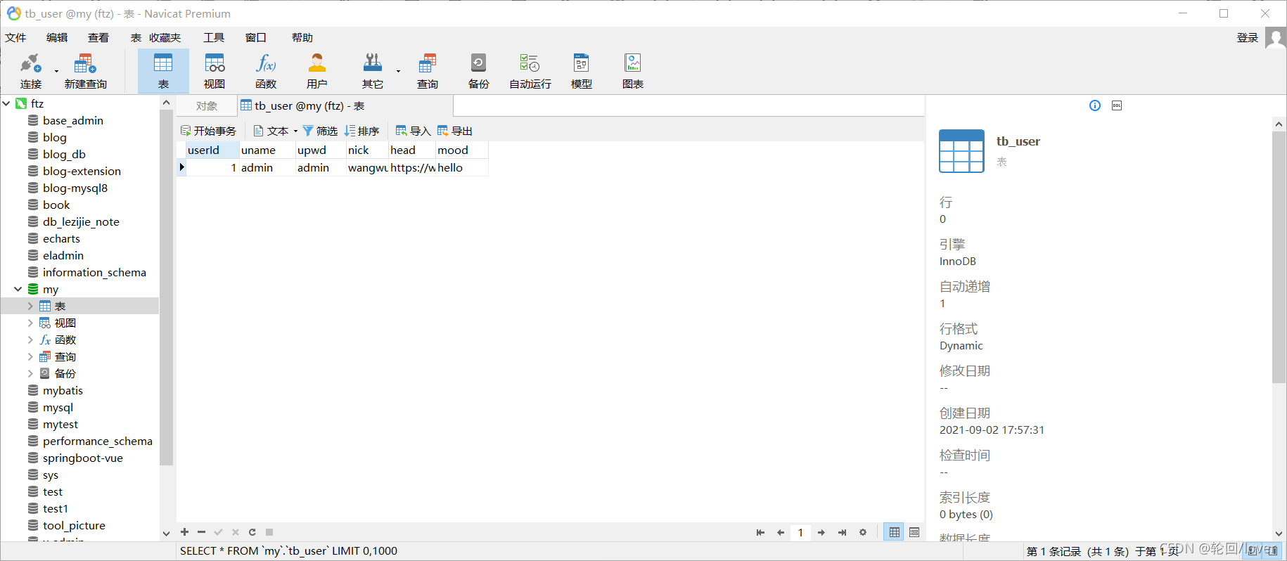 數據庫代碼:新建數據庫名叫my 建表名叫tb_user