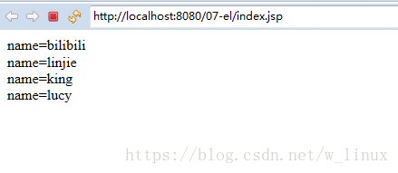 <%@page import="java.util.*"%><%@ page language="java" contentType="text/html; charset=UTF-8" pageEncoding="UTF-8"%><!DOCTYPE html PUBLIC "-//W3C//DTD HTML 4.01 Transitional//EN" "http://www.w3.org/TR/html4/loose.dtd"><html><head><meta http-equiv="Content-Type" content="text/html; charset=UTF-8"><title>Insert title here</title></head><body> <% List<String> names=new ArrayList<String>(); names.add("xlj"); names.add("lucy"); pageContext.setAttribute("names", names); %> <!-- 因為List底層是數(shù)組,所以可以這樣寫 --> names[1]=${names[1] }<br></body></html>客戶瀏覽器顯示結(jié)果