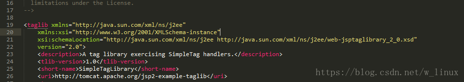 - 注冊:先找到j(luò)sp2-example-taglib.tld,將頭部以及注冊函數(shù)復(fù)制到自己創(chuàng)建的.tld文件中(.tld放在WEB-INF下)