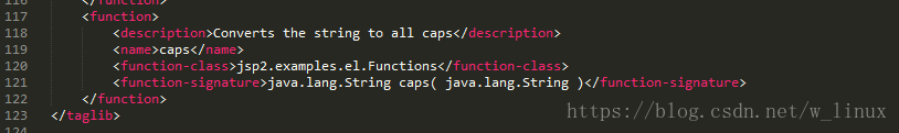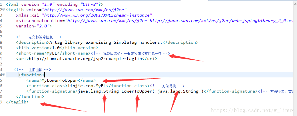 <?xml version="1.0" encoding="UTF-8"?><taglib xmlns="http://java.sun.com/xml/ns/j2ee" xmlns:xsi="http://www.w3.org/2001/XMLSchema-instance" xsi:schemaLocation="http://java.sun.com/xml/ns/j2ee http://java.sun.com/xml/ns/j2ee/web-jsptaglibrary_2_0.xsd" version="2.0"> <!-- 定義標(biāo)簽庫信息 --> <description>A tag library exercising SimpleTag handlers.</description> <tlib-version>1.0</tlib-version> <short-name>MyEL</short-name><!-- 標(biāo)簽庫名稱,一般定義成和文件名一樣 --> <uri>http://tomcat.apache.org/jsp2-example-taglib</uri> <!-- 注冊函數(shù) --> <function> <name>MyLowerToUpper</name> <function-class>linjie.com.MyEL</function-class><!-- 方法得類 --> <function-signature>java.lang.String LowerToUpper( java.lang.String )</function-signature><!-- 方法簽名 :需要返回值以及方法名、參數(shù)--> </function></taglib>