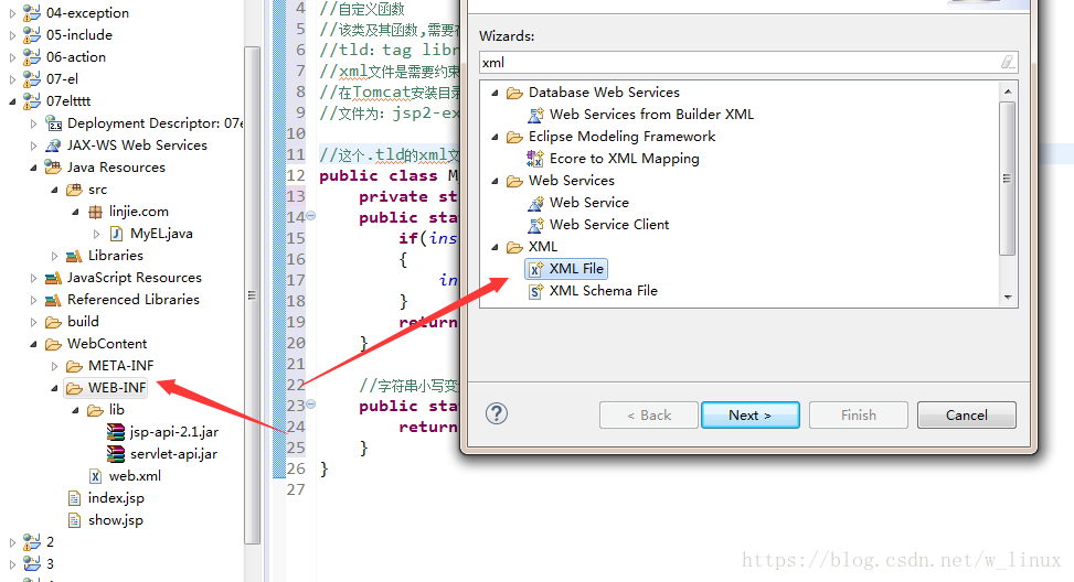 package linjie.com;//自定義函數(shù)//該類及其函數(shù),需要在擴展名為.tld的xml文件中注冊//tld:tag library definition(標(biāo)簽庫定義)//xml文件是需要約束的,即需要配置文件頭部。這個頭部約束可以從一下文件中進行復(fù)制//在Tomcat安裝目錄下:webapps\examples\WEB-INF\jsp2//文件為:jsp2-example-taglib.tld//這個.tld的xml文件,需要定義在當(dāng)前web項目的WEB-INF目錄下,在此目錄下創(chuàng)建以.tld結(jié)尾的xml文件//將jsp2-example-taglib.tld中頭部復(fù)制到創(chuàng)建的xml文件中//再將函數(shù)注冊,還是在jsp2-example-taglib.tld底部中復(fù)制public class MyEL { private static MyEL instance; public static MyEL getInstance() { if(instance==null) { instance=new MyEL(); } return instance; } //字符串小寫變大寫 public static String LowerToUpper(String str) { return str.toUpperCase(); }}2、將jsp2-example-taglib.tld中頭部部分以及底部的注冊函數(shù)部分復(fù)制到自己創(chuàng)建的tld(在WEB-INF下)文件中