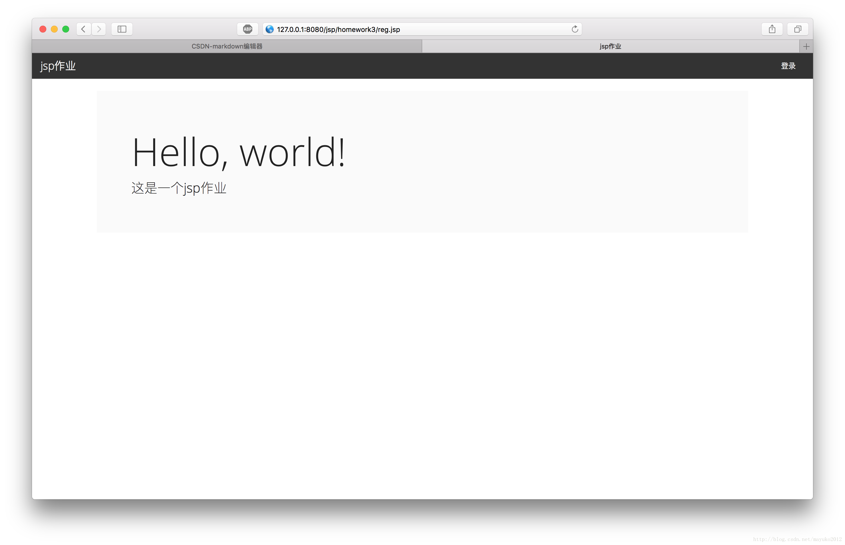 <!DOCTYPE html><html lang="zh-CN"><head> <meta charset="utf-8"> <meta http-equiv="X-UA-Compatible" content="IE=edge"> <meta name="viewport" content="width=device-width, initial-scale=1"> <title>jsp作業</title> <link href="css/bootstrap.min.css" rel="external nofollow" rel="external nofollow" rel="external nofollow" rel="external nofollow" rel="external nofollow" rel="stylesheet"></head><body><nav> <div> <div> <a href="./" rel="external nofollow" rel="external nofollow" rel="external nofollow" rel="external nofollow" rel="external nofollow" >jsp作業</a> </div> <div id="bs-example-navbar-collapse-1"> <ul> <li><a href="login.jsp" rel="external nofollow" rel="external nofollow" rel="external nofollow" rel="external nofollow" rel="external nofollow" rel="external nofollow" >登錄</a></li> </ul> </div> </div></nav><div> <div> <h1>Hello, world!</h1> <p>這是一個jsp作業</p> </div></div></body></html>