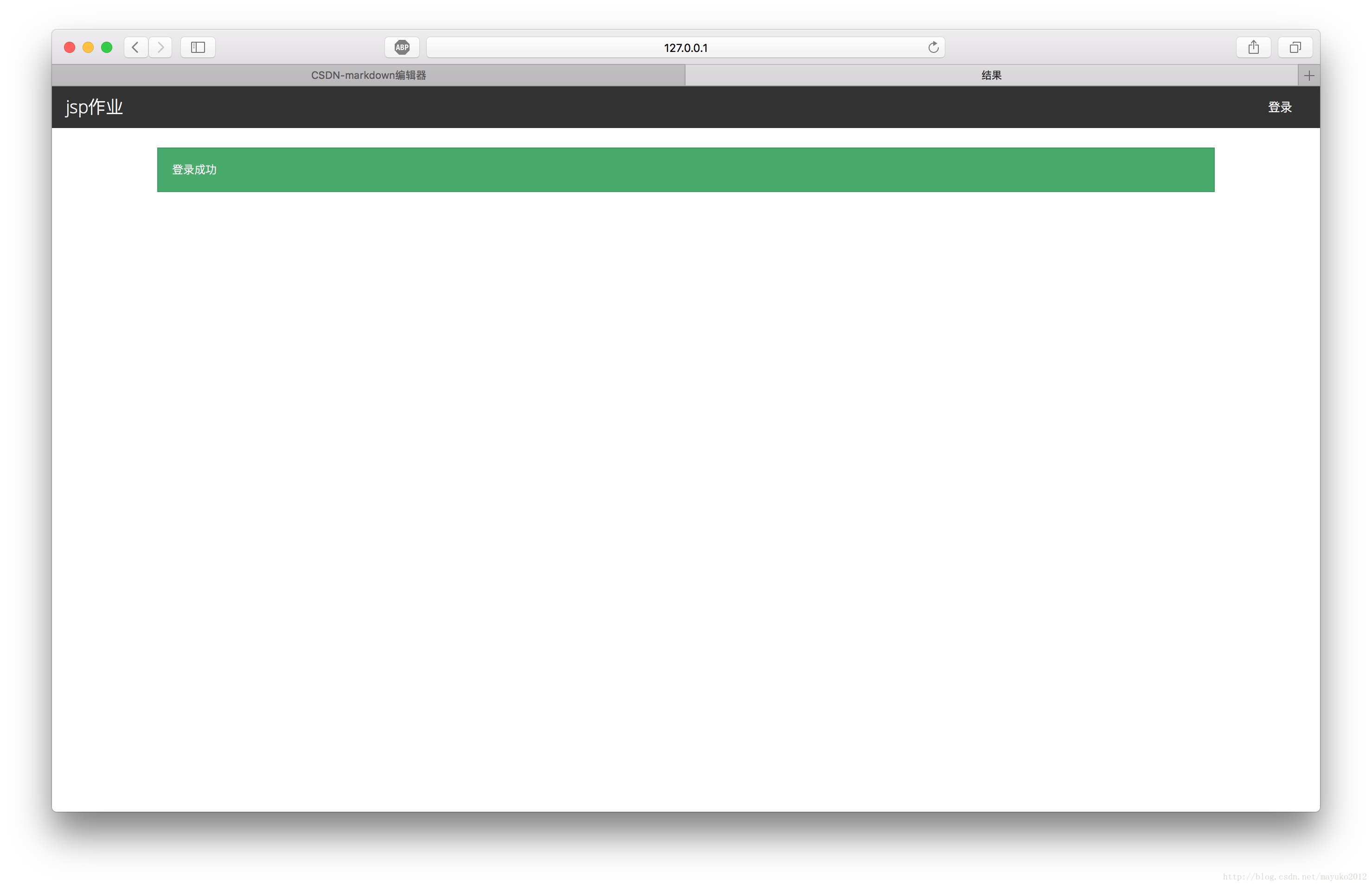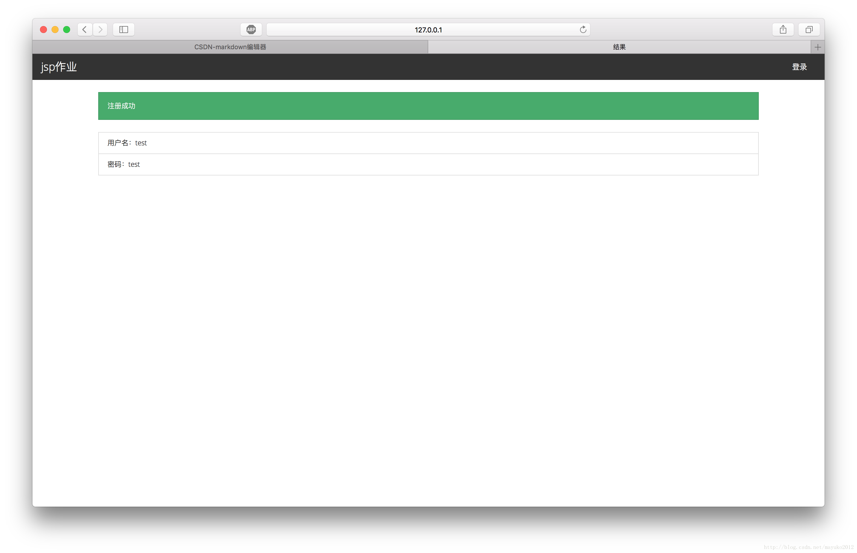<%@ page contentType="text/html; charset=utf-8" language="java"%><html lang="zh-CN"><head> <meta charset="utf-8"> <meta http-equiv="X-UA-Compatible" content="IE=edge"> <meta name="viewport" content="width=device-width, initial-scale=1"> <title>結果</title> <link href="css/bootstrap.min.css" rel="external nofollow" rel="external nofollow" rel="external nofollow" rel="external nofollow" rel="external nofollow" rel="stylesheet"></head><body><nav> <div> <div> <a href="./" rel="external nofollow" rel="external nofollow" rel="external nofollow" rel="external nofollow" rel="external nofollow" >jsp作業</a> </div> <div id="bs-example-navbar-collapse-1"> <ul> <li><a href="login.jsp" rel="external nofollow" rel="external nofollow" rel="external nofollow" rel="external nofollow" rel="external nofollow" rel="external nofollow" >登錄</a></li> </ul> </div> </div></nav><div> <% String username = request.getParameter("username"); String password = request.getParameter("password"); String password2 = request.getParameter("password2"); %> <% if(password.equals(password2)){ out.println("<div class="alert alert-success" role="alert">注冊成功</div>"); out.println("<ul class="list-group">"); out.println("<li class="list-group-item">用戶名:" + username + "</li>"); out.println("<li class="list-group-item">密碼:" + password + "</li>"); out.println("</ul>"); } else{ out.println("<div class="alert alert-danger" role="alert">兩次密碼輸入不一致,請重新輸入</div>"); } %> <!-- <%=username %> <%=password %> <%=password2 %> --></div>效果