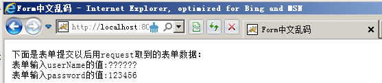<%@ page language="java" import="java.util.*" contentType="text/html;charset=gb2312"%><html> <head> <title>Form中文亂碼</title> </head> <body> <font size="2"> 下面是表單提交以后用request取到的表單數據:<br> <% String userName = request.getParameter("userName"); String password = request.getParameter("password"); out.println("表單輸入userName的值:" + userName + "<br>"); out.println("表單輸入password的值:" + password + "<br>"); %> </font> </body></html>在上面的程序中,如果表單輸入沒有中文,則可以正常的顯示當輸入的數據中有中文的時候,得到的結果如圖所示。