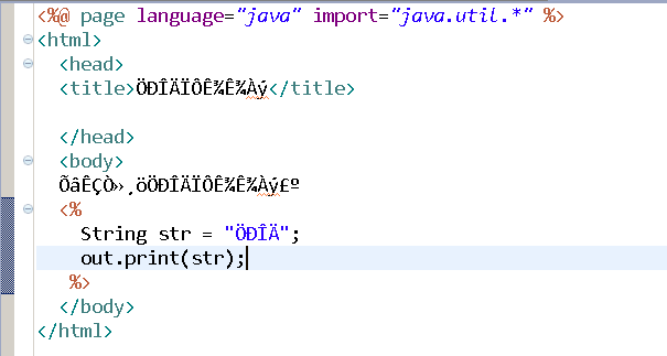 <%@ page language="java" import="java.util.*" contentType="text/html; charset=GB2312" %><html> <head> <title>中文顯示示例</title> </head> <body> 這是一個中文顯示示例: <% String str = "中文"; out.print(str); %> </body></html>