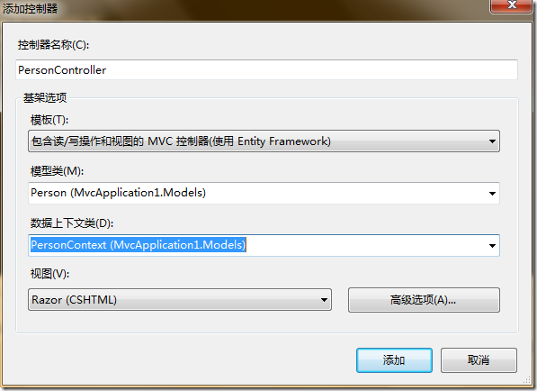 public class Person {public int ID { get; set; }public string FirstName { get; set; }public string LastName { get; set; } }在Controls文件夾內創(chuàng)建PersonController,選擇使用Entity Framework的模版、模型類,創(chuàng)建數(shù)據(jù)上下文類,如下: