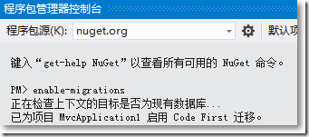 現(xiàn)在,我們想啟動EF的自動遷移功能。點擊"工具"-"庫程序包管理器"-"程序包管理器控制臺",輸入enable-migrations:
