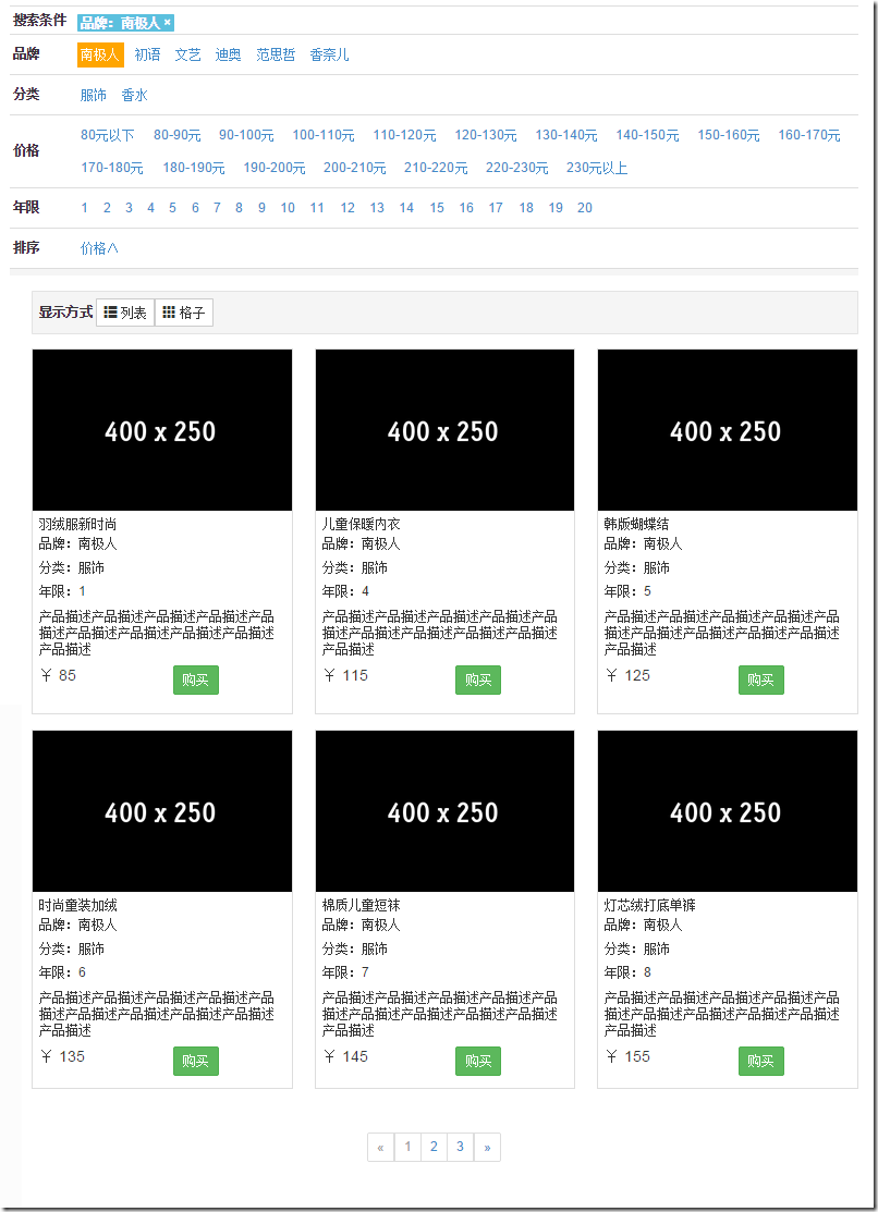 中間部分為產品展示,提供了列表和格子這2種顯示方式。