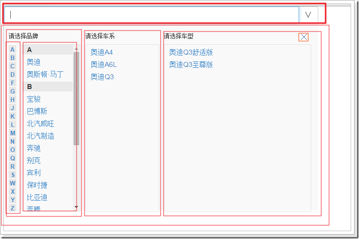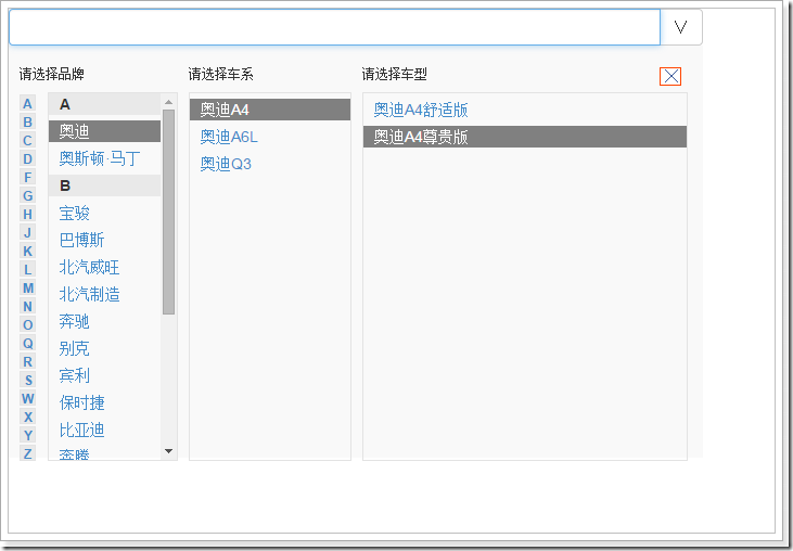 #carcategory-picker-outer { background: #f9f9f9; padding: 10px; width: 640px; height: 380px; position: relative; display: none;}#PreLetter { border: 0px solid blue; width: 21px; float: left;}#PreLetter a:link{ display: block; text-decoration: none; clear: both; font-size: 10px; text-align: center; padding-top: 0px; border: 1px solid #e3e3e3; width: 15px; height: 15px; background-color: #e9e9e9; margin-top: 2px; font-weight: bold;}#PreLetter a:hover { border: 1px solid blue;}#PreLetter a:visited { border: 1px solid #e3e3e3;}#pinpai { border: 0px solid green; float: left;}#AllPinPai { border: 1px solid #e3e3e3; margin-left: 5px; float: left; padding-bottom: 0px; width: 120px; height: 340px; overflow-y: auto;}#AllPinPai dl dd a { text-decoration: none; display: block; padding-left: 10px;}#AllPinPai dl dd { padding-left: 0px;}#AllPinPai dl dd a:hover { /*background-color: gray;*/ color: white;}#AllPinPai dl { margin-bottom: 5px;}#chexi { border: 0px solid orange; float: left; margin-left: 10px; display: none;}#AllCheXi { width: 150px; height: 340px; overflow-y: auto; border: 1px solid #e3e3e3;}#AllCheXi dl dd a { text-decoration: none; display: block; padding-left: 10px;}#AllCheXi dl dd { padding-left: 0px;}#AllCheXi dl dd a:hover { color: white;}#AllCheXi dl { margin-bottom: 5px;}#chexin { border: 0px solid red; float: left; margin-left: 10px; display: none;}#AllCheXing { width: 300px; height: 340px; overflow-y: auto; border: 1px solid #e3e3e3; }#AllCheXing dl dd a { text-decoration: none; display: block; padding-left: 10px;}#AllCheXing dl dd { padding-left: 0px;}#AllCheXing dl dd a:hover { background-color: gray; color: white;}#AllCheXing dl { margin-bottom: 5px;}dt { background-color: #e9e9e9; padding-left: 10px;}dl { border: 0px solid red;}dd { padding-left: 10px; line-height: 15px; margin-top: 5px; margin-bottom: 0px; border: 0px solid blue; /*background-color: gray;*/}.selected { background-color: gray; color: white;}.cancel { width: 20px; height: 17px; position: absolute; display: block; top: 20px; right: 20px; background-image: url("../img/close.png"); border: 1px solid orangered; background-color: orangered;}.input-group { width: 640px;}以上就是這篇文章的全部內容了,希望本文的內容對大家的學習或者工作具有一定的參考學習價值,謝謝大家對的支持。如果你想了解更多相關內容請查看下面相關鏈接